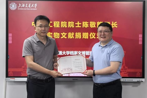 近日,上海交通大学档案文博中心举行了陈敬熊院士物品捐赠仪式。中国航天科工二院二十三所科委副主任王武庆主任一行向学校档案文博中心捐赠1950届电信研究生陈敬熊院士的学术研究笔记手稿及生前使用过的眼镜、钢笔等物品。目前,部分院士实物正在闵行校区校史博物馆陈列展出。